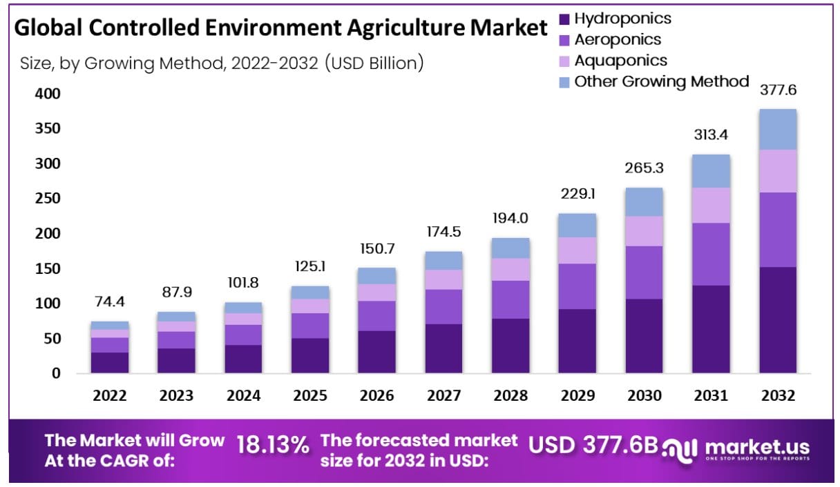 There is quite a bit riding on CEA as a way to help with food security but also to remove some of the dependence on our natural resources, i.e., mainly land and water. The global CEA market is expected to grow 5X between 2022 and 2032, thanks to the rising demand for fresh produce all year round, especially in urban centers. That pesky seasonality is fast becoming a thing of a luddite past.